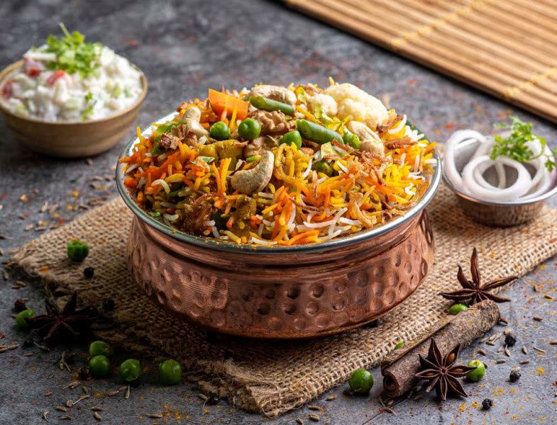 Fragrant basmati rice cooked with a medley of vegetables and aromatic spices, offering a hearty and flavorful meal option.
